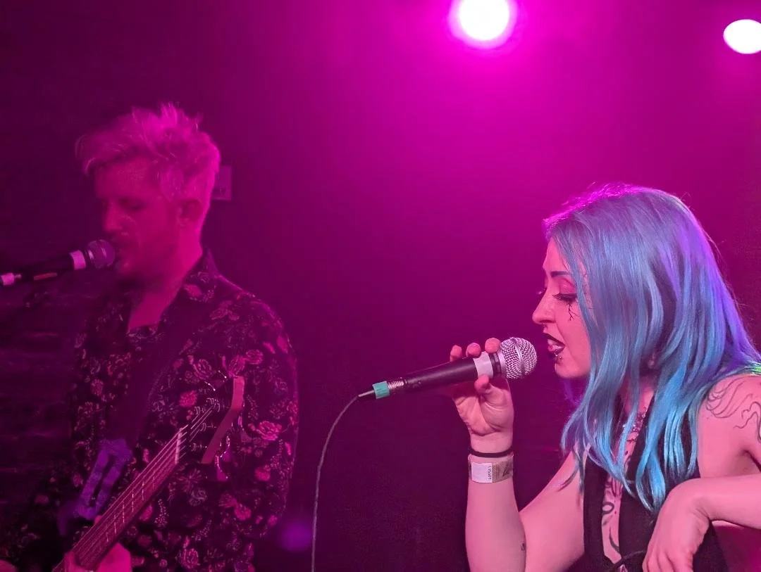 Opening the night was “Loveless”, a newer song which toys with the idea of love not existing as an emotion, delivered in a provocative yet explorative way. Band members Gemma and Thom compliment each other’s vocals for this track, adding the feeling of different perspectives in their respective parts. Gemma’s parts give off this idea of marketing a replacement for love, in a dark and Stepford Wives way. Thom chimes in with a more abrupt and sinister vibe, giving off imagery of a conveyer belt business world, where love must be bought.